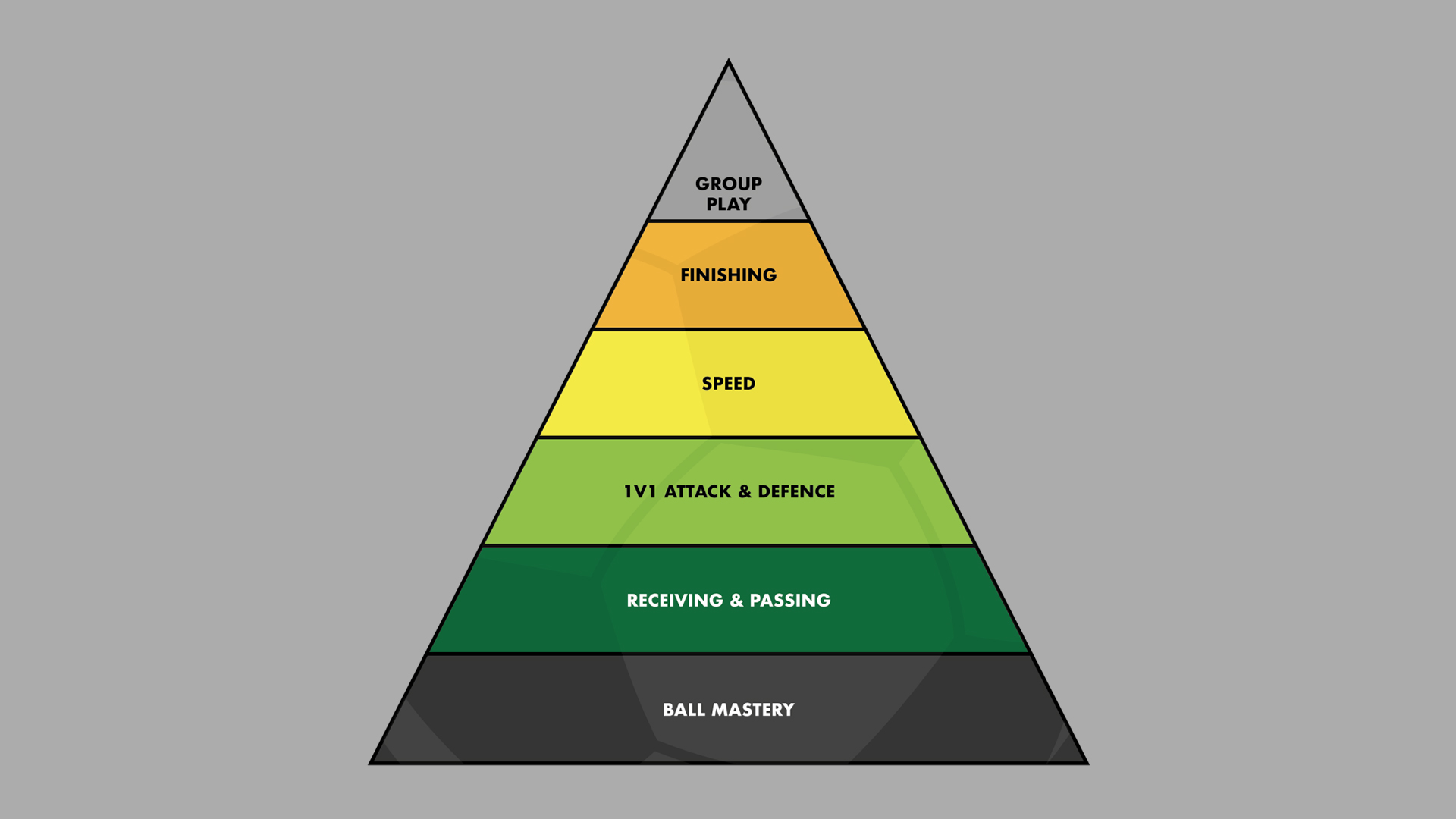 Palli manipuleerimine on iga mängija arengu vundament ja on tähtsal kohal, et püramiidil edasi liikuda. See ei ole nagu redel, kus järgmisele tasemele saamiseks, tuleb eelmine selgeks saada, vaid iga samm on oluline järgmiseks ning mängija areng saavutatakse erinevate tehnikate raskusastmete tõusuga.
